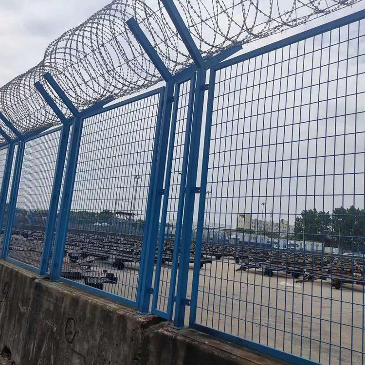 监狱钢网墙又称作"监狱隔离网",该产品主要采用高强度钢丝网片与蛇覆式刀片刺网和防盗连接件组合而成,防腐形式有电镀、热镀、喷塑、浸塑。产品特点:立柱采用60*60方管,壁厚2.0mm,焊接成Y型,表面浸塑处理,网片高度2000mm-3000mm,长度2500mm-3000mm,,V型顶端安装刀片刺网,直径采用50cm-60cm,刀片刺网主要是由热镀锌钢板或不锈钢薄板冲压而成的。