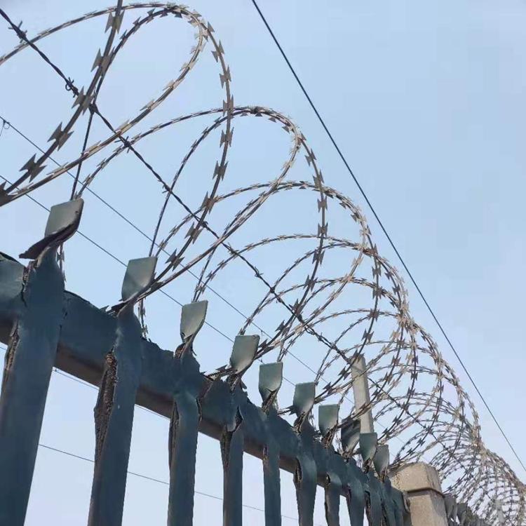 也就是简略的一部了,把用铁丝串接在一起的刀片刺网,摆开固定就行了。有时候为了防护效果更强,会在Y 型支柱的支架上各加上一条直线型的刀片刺绳。既漂亮又防护强!