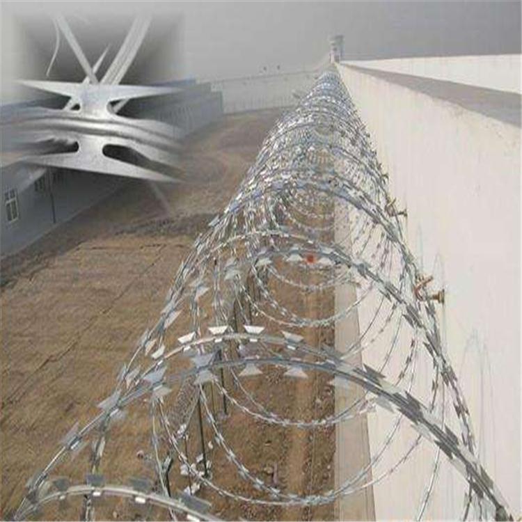 监狱专门用来防护的铁丝网学名叫做镀锌刀片刺绳,可以直接安装在墙面上,也可以在墙面安装围栏网以后再围栏网上边安装。