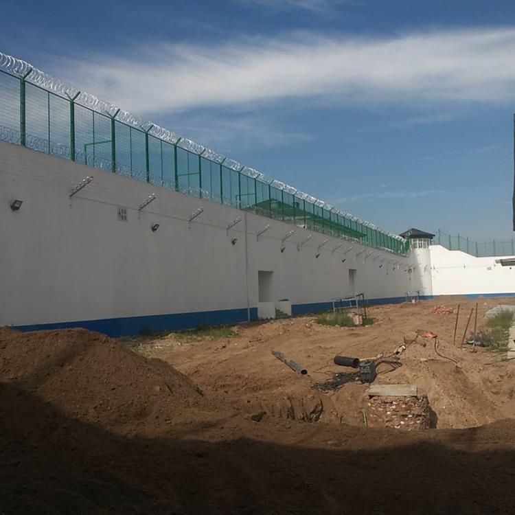 后就是监狱金属隔离网墙和立柱的表面防腐处理,整体采用除锈+防腐+浸塑的防腐工艺。专用PVC 塑粉,一般上塑量≥0.8mm,表面无真空、开裂、漏塑、塑液流淌等不良现象,颜色通常为草绿色、墨绿色和白色。监狱钢网墙 看守所钢网墙