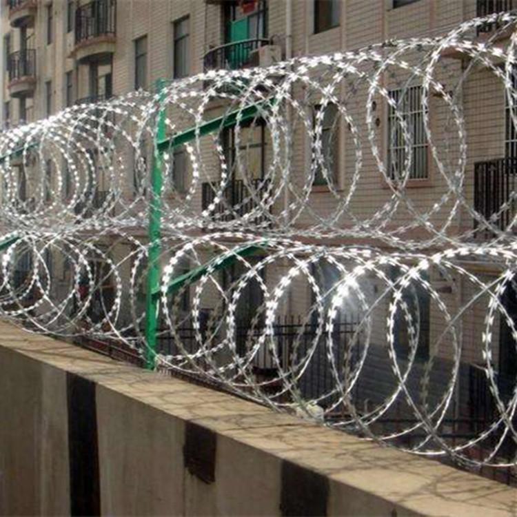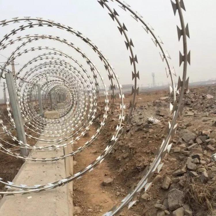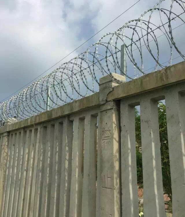 2012年最新《铁路线路防护栅栏》[通线(2012)8001]通用参考图出炉! 文献规定:铁路栅栏一改往日焊接钢丝网栅栏、刺丝网栅栏等产品,改为防御性更强、寿命更长久的:钢筋混凝土栅栏+0.5米高刺丝滚笼的防护栅栏。详细内容如下: 钢筋混凝土栅栏:详见图纸 0.5米高刺丝滚笼组成:刺丝刺绳+刀刺滚笼+钢丝+立柱 图集中:5、刺丝滚笼:(1)刺丝滚笼采用刀片刺绳绕圈后相邻两圈每隔120度用刺丝连接卡固定,张开后形成蛇腹网状,闭合后刀片刺绳卷径为50cm,张开后每交叉圈安装间距20cm,直径不小于45cm。(2)刀片刺绳由冲切钢板采用机械轧在钢丝上成型,刀刺宽度22mm,刀刃垂直间距15mm,刀刺纵向间距34mm,芯丝直径为2.5mm。刀片厚度0.5mm的Q195钢板网冲切制作。芯丝由HPB300 -6.5mm高线钢丝冷拔加工。(3)刺丝滚笼由刺丝连接卡扣与固定在支架上的纵向拉筋相连接。纵向拉筋与支架的连接采用-2.5mm的冷拔镀锌钢丝绕2圈后拧紧固定。支架设置在跨度3m防护栅栏的立柱和跨中位置,其中跨度进设置与立柱上部,支架与防护栅栏采用支架抱箍连接,对于已经安装金属网片的防护栅栏。刺丝滚笼直接采用-2.5mm的冷拔镀锌钢丝或刺丝连接卡扣固定于金属网横片和金属丝上。(4)刺丝滚笼的下缘距离钢筋混凝土防护栅栏上缘的垂直距离为0.05m.6.陡坡地段防护栅栏下槛下部与地面间的间隙采用C25混凝土封闭,宽度180mm,与立柱两倒平齐,埋入地面以下不小于0.3m.每单元于地面处留移100mm泄水孔。
