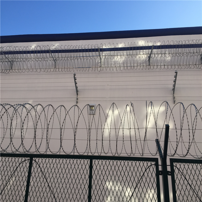 监狱钢网墙、监狱隔离网普通顶端都设有V型支架与立柱焊接。资料通常选择和立柱同等资料或者稍小规格资料搭配运用。V型支架的加装是为了将蛇腹形刀刺网固定在钢网墙顶部,从而有效的增加监狱钢网墙的防攀爬性和平安性。