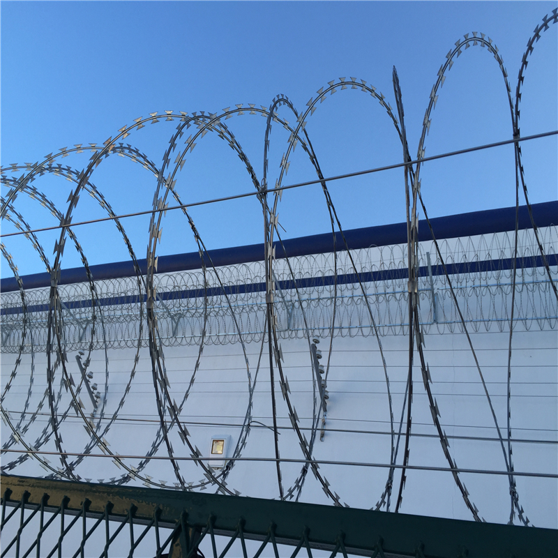 监狱刀刺隔离网|监狱围墙网主要是采用高强度的刀片刺网与普通防护网的结合,由v型支架立拄,加强型焊接片网,安全防盗连接件和刀片刺网组成.刀片刺网是一种新型防护网,由锐利尖角镀锌钢板或不锈钢薄板做刀片,钢丝做芯线组合而成的防护器材.是由V型支架立柱,加强型焊接片网,安全防盗连接件和热镀锌刀片刺笼组成强度和安全防御性级别很高。近年来,被广泛应用在监狱,军事基地等高安全场所。注:如果在监狱护栏网顶部加装刀片刺丝、刀片刺绳后又很好的增强了安全防护性能。采用电镀、热镀、喷塑、浸塑等防腐形式,具有很好的抗老化、抗晒、耐候等特点。