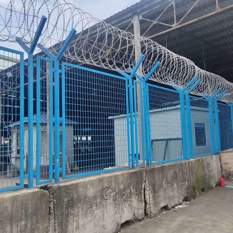 监狱防护网又称监狱护栏网或监狱隔离栅,主要是采用高强度的刀片刺网与普通防护网的结合,由V型支架立拄,加强型焊接片网,安全防盗连接件和刀片刺网组成。刀片刺网是一种新型防护网,由锐利尖角镀锌钢板或不锈钢薄板做刀片,钢丝做芯线组合而成的防护器材。 监狱防护网刀片刺网具有吓阻、防翻越等效果,材质坚硬,高强度,高张力,造型设计独特,不宜触摸,因而能达到很好的防护隔离效果。