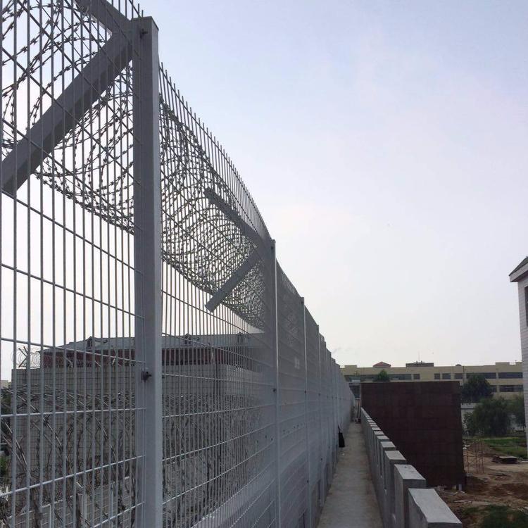 监狱钢网墙又名监狱铁丝网、监狱防护网、监狱隔离网、监狱防攀爬网、监狱警戒网、钢网墙等;一般采用低碳钢丝焊接成网片,热镀锌刀片刺绳,Y型矩形钢立柱组合而成,Y型矩形钢立柱顶端可带V型网加强筋网也可不带,带上v型加筋网可增加钢网墙的抗冲压力。