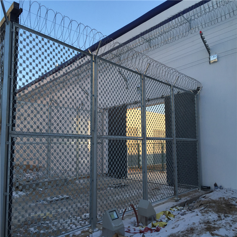 监狱钢网墙,监狱通式网,监狱防逃网,刀刺护栏网具有:强度高、钢性好、光亮饱满、色彩鲜艳、造型美观、视野广阔、耐酸、耐碱、耐自然老化的特点,使用寿命在20年以上,且具有模块化结构,安装、重组十分方便。广泛用于:高速公路、铁路、机场、市政街道、庭院围墙、体育设施、游乐场所、园林护栏、海水养殖等领域。它既是当今户外通用的涂塑产品,又是含有高新技术的环保型产品,更是环氧及聚乙烯涂塑防腐的升级换代的新产品。开发区隔离栅的立柱设计;立柱是隔离栅的主要支撑构件,立柱的强度和稳定性直接关系到隔离栅的使用效果和寿命。立柱的选用与设计主要考虑因素为风力,同时考虑人、畜造成的破坏。材料若选用钢板网和金属网,其支撑立柱一般采用钢或钢塑立柱。出于造价方面的考虑,一般情况下钢板网和金属网仅仅在互通立交、停车区服务区等具有比较重要的设施和对景观有较高要求的地区使用,对于一般路段仍宜采用刺铁丝隔离栅。刺铁丝隔离栅立柱的主要材料有型钢立柱、钢筋混凝土立柱、木立柱、复合材料立柱等。材料的选取应考虑景观协调性、与网片或刺丝的配合、施工难易程度、防盗等因素,力求做到因地制宜,就地取材。在林区由于木材资源丰富,同时木制立柱与周围景观比较协调,立柱宜采用烧制原木,直接埋于土中,并对立柱做防腐处理;在沙漠、戈壁地区宜采用钢筋混凝土预制件立柱;在农区若地势比较平坦地形起伏不大宜采用钢筋混凝土立柱,在地形比较复杂的地区,考虑到钢筋混凝土立柱的搬运比较困难,单根重量达到70千克以上,立柱宜采用型钢立柱;在偷盗比较严重的地区可考虑没有回收利用价值的复合材料立柱。目前市场上有一种GRC(玻璃纤维增强水泥)复合隔离栅立柱,这种隔离栅立柱外形为矩形和圆形两种,立柱由镁质胶凝材料、玻璃纤维、竹筋增强材料、挂钩和改性PVC外壳组成,具有环保节能、结实耐用、安装方便、没有再利用价值、防止偷盗等优点。