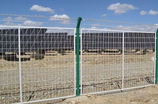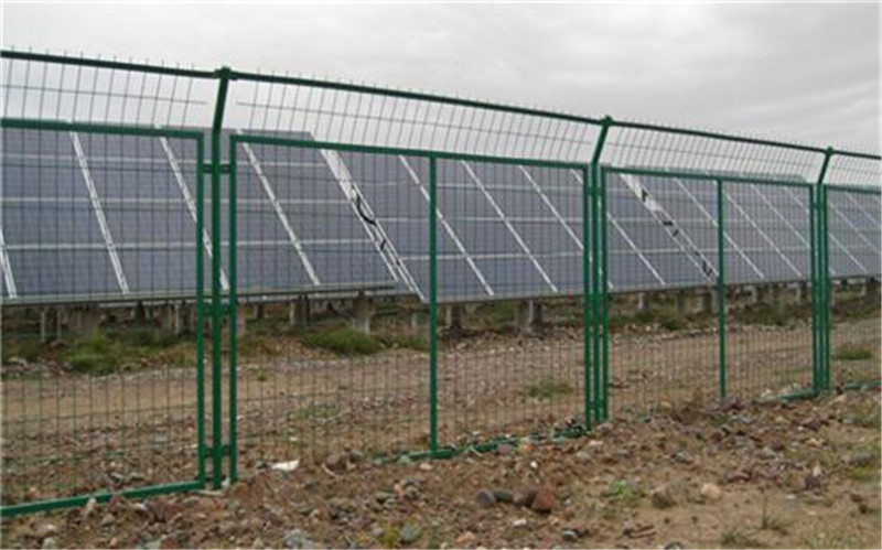 光伏太阳能网围栏是一种新型的围网,采用优质低碳钢丝作为原材料,表面浸塑具有日久抗腐蚀、抗紫外线不怕雨淋的特点。这种工艺有无需模具、加工成本低、成型容易、可加工各种外形等特点被广范使用。是专门为光伏电站设计的防护设备,主要是用在光伏电站各个区域的防护和隔离.它有效防止了变电站内外的人身安全和变电器等设备的防盗,是变电站的防护新产品。具有较长的使用年限。最常见的形式主要就是边框隔离防护网.