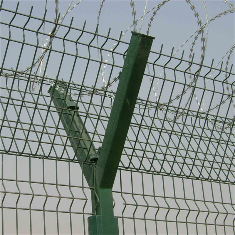 机场护栏 刀片刺丝机场围界网,是由V型支架立柱加强型焊接片网,安全防盗连接件和热镀锌刀片刺网组成强度和安全防御性级别很高。如果在顶部加装刀片刺丝、刀片刺网后又很好的增强了安全防护性能。采用电镀、热镀、喷塑、浸塑等防腐形式,具有很好的抗老化、抗晒、耐腐蚀等特点。其产品造型美观、花色多样,既起到围栏作用,又起到美化作用。由于具有安全性高、防攀爬能力好,网片连接方式采用特制SBS紧扣件,有效防止人为的破坏性拆卸,横向四道折弯加强筋,使网面强度显著增加。