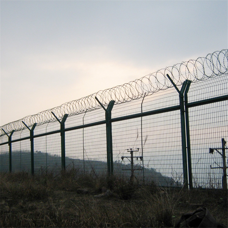 机场护栏网又称作“Y型安全防御护网”,是由V型支架立柱,加强型焊接片网,安全防盗连接件和热镀锌刀片刺笼组成强度和安全防御性级别很高。近年来,被广泛应用在机场,军事基地等高安全场所。