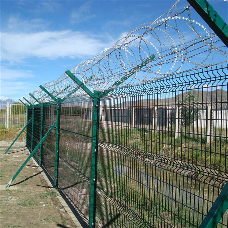 机场围界又称作“Y型安全防御护网”,是由V型支架立柱,加强型焊接片网,安全防盗连接件和热镀锌刀片刺笼组成强度和安全防御性级别很高。近年来,被广泛应用在机场,军事基地等高安全场所。如果在机场护栏网顶部加装刀片刺丝、刀片刺绳后又很好的增强了安全防护性能。机场护栏网造型美观、花色多样,既起到围栏作用,又起到美化作用。由于具有安全性高、防攀爬能力好,网片连接方式采用特制SBS紧扣件,有效防止人为的破坏性拆卸,横向四道折弯加强筋,使网面强度显著增加。