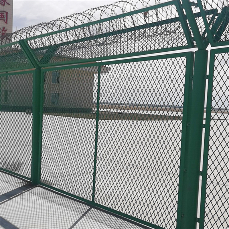 监狱物理安防隔离网生产厂家通常采用钢丝直径为5mm、6mm、6,5mm,网孔采用50mm*100mm、50mm*50mm、50mm*200mm、50mm*150mm, 组成结构:首先把网片焊接在铁管框架上,框架是方管或者圆管焊接成的框架结构,在框架上焊接用于个立柱连接的连接板,用防盗螺栓与立柱连接。为了保证网片的防拆卸性能,网片连接方式采用特制防盗紧扣件,有效防止人为的破坏性拆卸。