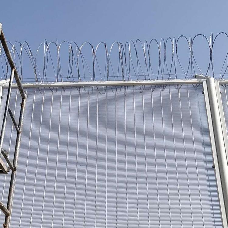 监狱358护栏网一般顶端都设有V型支架与立柱焊接。材料通常选择和立柱同等材料或者稍小规格材料搭配使用。V型支架的加装是为了将蛇腹形刀刺网固定在隔离网顶部,蛇腹形刀刺网有不锈钢刀片刺绳、镀锌刀片刺绳,还有电泳刀片刺绳。从而有效的增加监狱隔离网的防攀爬性和安全性。