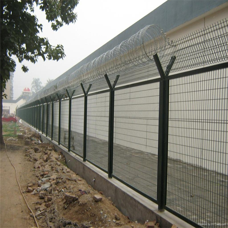 看守所防攀爬钢网墙是使用在监狱、看守所等高戒备单位的具有高防护功能的隔离产品,其外观独特,网格状的设计属于镂空围墙,配合锋利的刀刺网能有效防止在押人员出逃。一般看守所防攀爬钢网墙立柱的样式为Y型柱,这也就是为啥很多人把看守所防攀爬钢网墙又称为Y型柱隔离网。看守所防攀爬钢网墙一般应用在监狱或者看守所巡逻通道的两侧,顶部设有蛇腹型刀刺网,具有很强的防攀爬能力,使用材质坚硬敦厚,还有极强的防破坏能力和很强的威慑力,禁止犯人越狱逃脱。