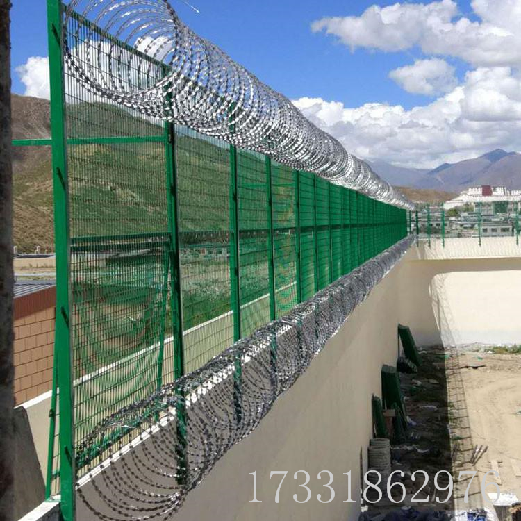 看守所监墙内侧刀刺钢网墙高度是多少。看守所刀刺钢网墙高度有2.5m和4.5m两种,也是常用的两种。这两种高度都包括顶部50公分蛇腹网,底部为刀刺钢网墙。4m高刀刺钢网墙可以用上下两片来连接。