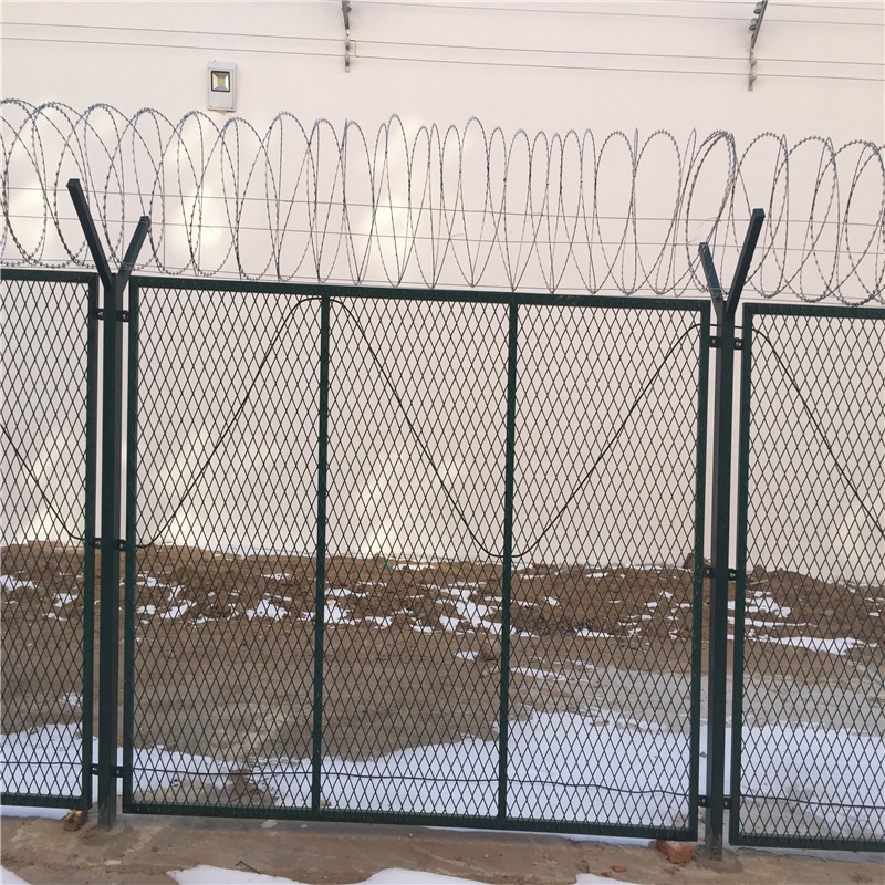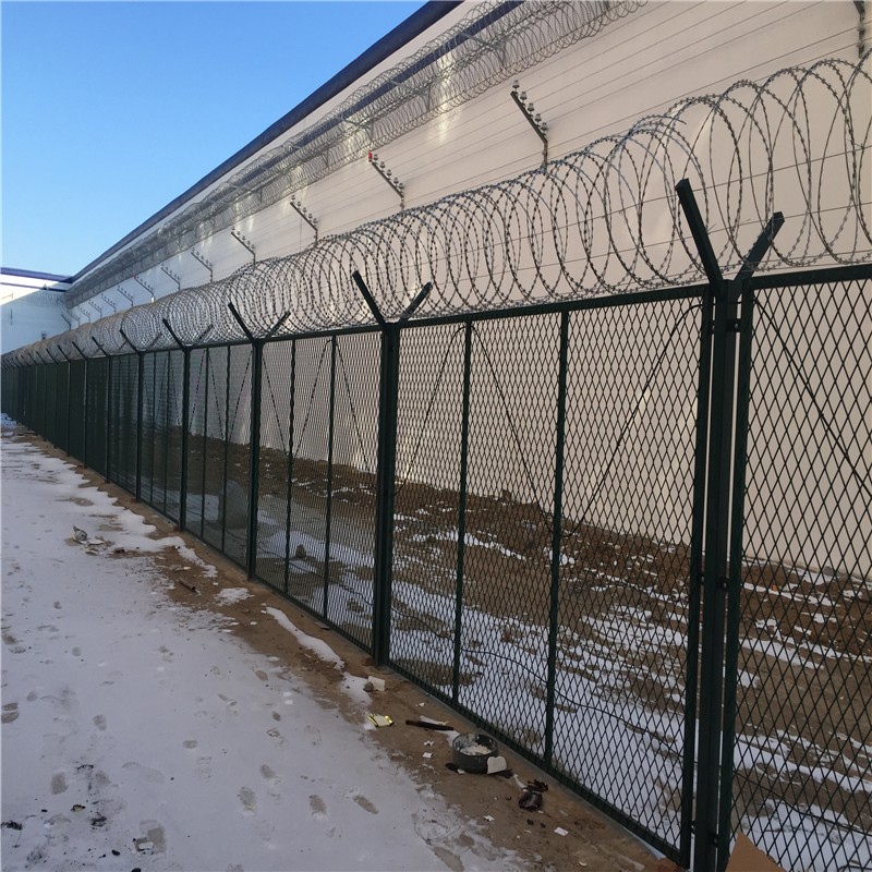 监狱围墙外侧金属隔离网也叫监狱隔离网,近几年全国各地监狱都在进行改造。很多设计院工程师询问我公司监狱隔离网的常用规格尺寸,以及规格规范。今天就为大家简单介绍下监狱隔离网常用规格尺寸以及规范。监狱隔离网原材料主要采用高强度低碳钢丝焊接成型,上部加Y型固定支架。由焊接钢网结合刀片刺网组合而成。