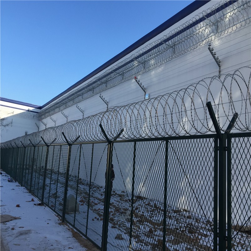 监狱刀片刺网主要是由热镀锌钢板或不锈钢薄板冲压而成的,它拥有尖锐的刀片,高张力镀锌钢丝或者不锈钢丝做芯线组合而成的产品。由于刺网的形状很特别,而且每个角度都有尖状刀片,因而能达到极好的防御保护效果。产品具有结构新颖、坚固紧密、网面平整、网孔均匀、刀锋锐利、防攀爬、抗腐蚀性强等特点。建设于监狱的内外墙地面及高墙之上,形成一道高不可攀、难以逾越的隔离障碍。具有吓阻、防翻越等效果,材质坚硬,高强度,高张力,造型设计独特,不宜触摸,因而能达到极好的防护隔离效果.
