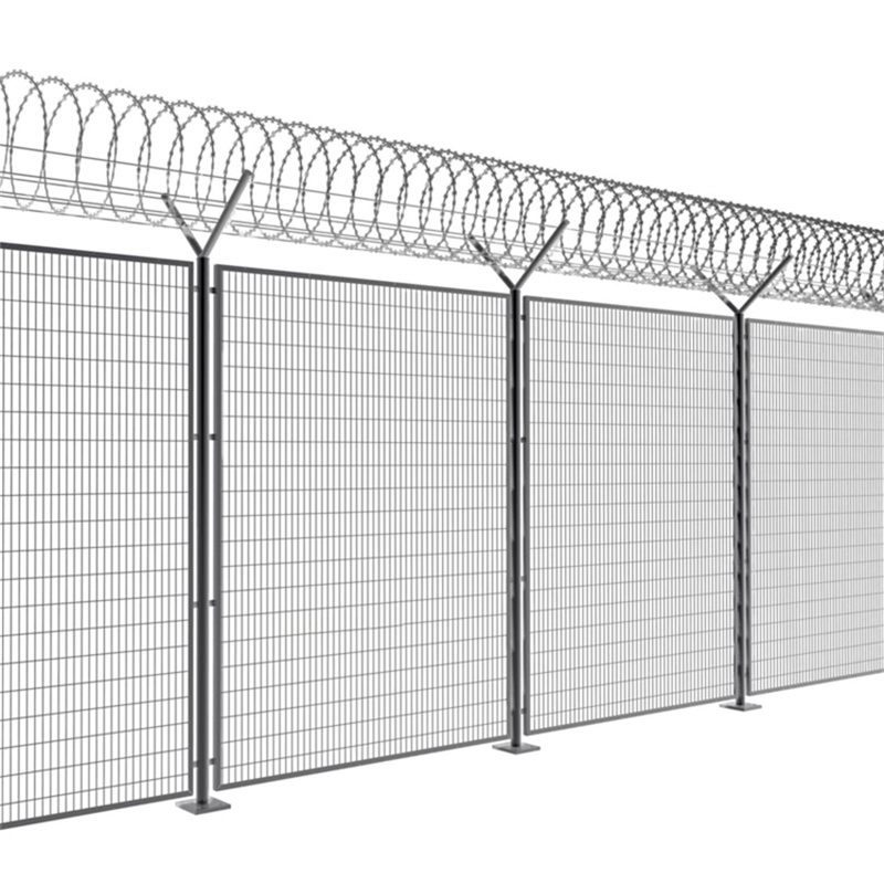 监狱护栏网又称作“Y型安全防御护网”,是由V型支架立柱,加强型焊接片网,安全防盗连接件和热镀锌刀片刺笼组成强度和安全防御性级别很高。现被广泛应用在监狱,军事基地等高安全场所。注:如果在监狱护栏网顶部加装刀片刺丝、刀片刺绳后又很好的增强了安全防护性能。采用电镀、热镀、喷塑、浸塑等防腐形式,具有很好的抗老化、抗晒、耐候等特点。其产品造型美观、花色多样,既起到围栏作用,又起到美化作用。由于具有安全性高、防攀爬能力好,网片连接方式采用特制SBS紧扣件,有效防止人为的破坏性拆卸,横向四道折弯加强筋,使网面强度显著增加。
