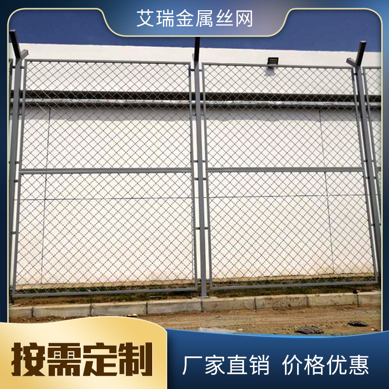 1. 网丝4mm2. 网孔75mm*150mm3. 网片2760mm*1797mm4. 边框30mm*50mm*2mm5. 基础尺寸600mm*600mm*700mm,金属网片网丝采用HPB300直径6.5mm高线钢丝冷拔加工,上部向外折角30°焊接成型后整体镀锌并进行热浸塑处理。镀锌量270g/㎡,浸塑厚度0.8mm-1.0mm,立柱支架采用50*30mm 壁厚2mmQ235矩形钢管和宽50mm厚度4.5mm长度分别为246mm和428mm的两块Q235扁铁焊接制作。