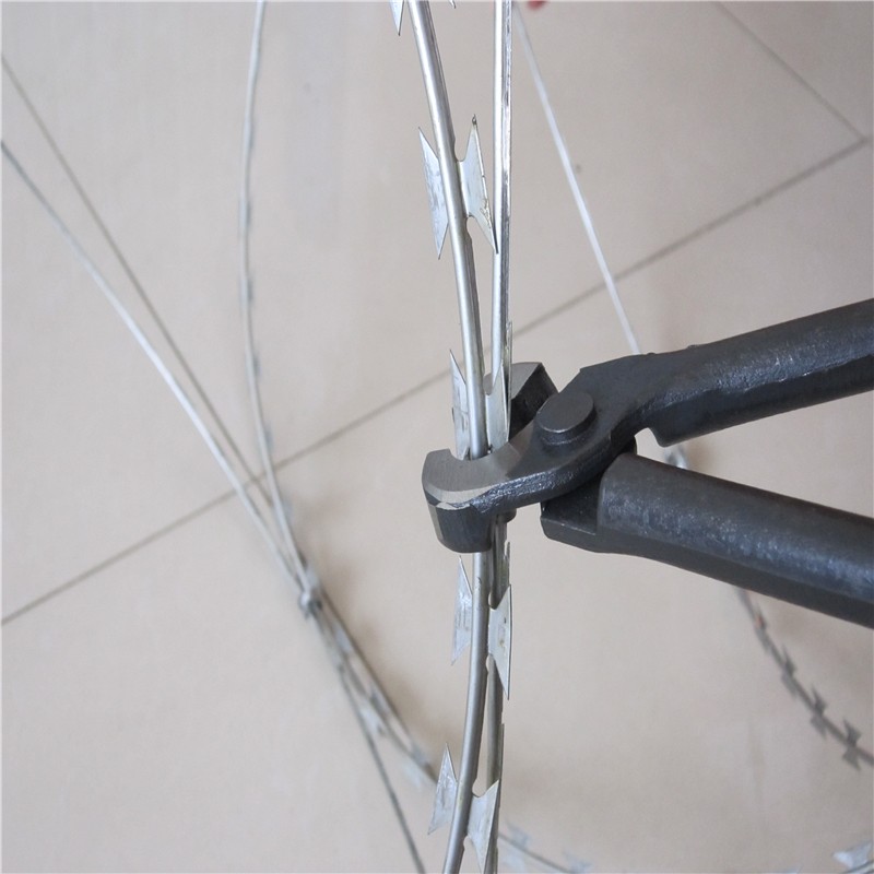 平板式刀片刺绳护栏网是刀片刺绳护栏网的一种新的应用方式,它是将单圈式刀片刺绳平压成板状,或将两件单圈刺绳压平后交叉相错使用,外表美观而且实用,可与直线式刀片刺网搭配使用,构成下直线上平板的防护墙,或仅用平板式刺网构成防护墙。