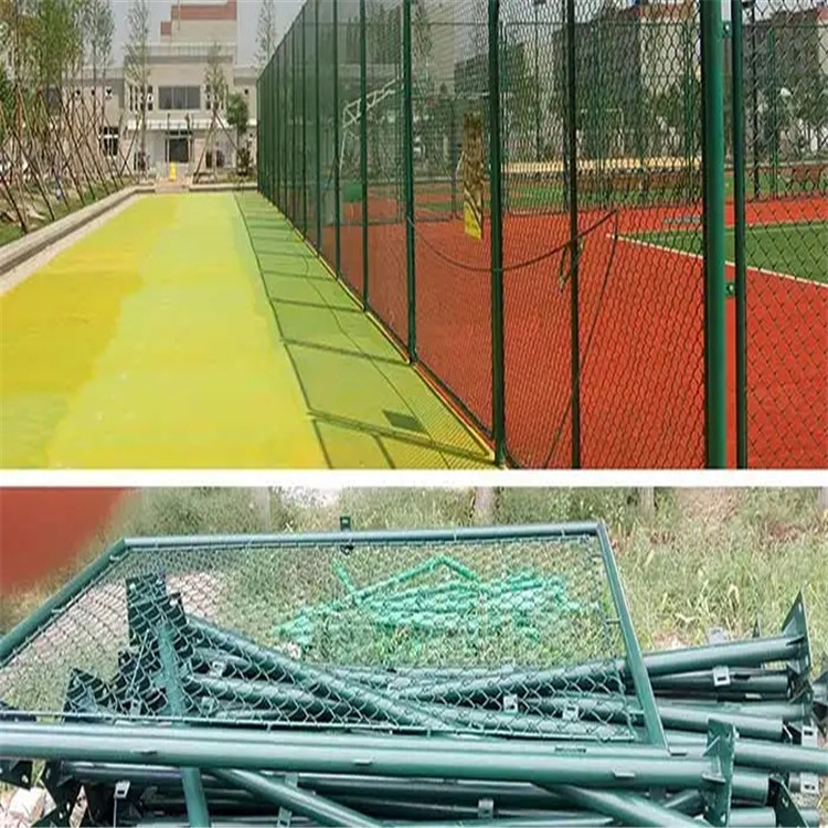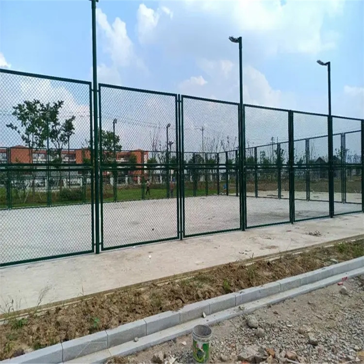 球场围网施工工序为:底板固定-网立柱焊接-顶、底横杆焊接-挂网施工-网门施工、喷漆。焊围网地板及立柱:测量放线,按设计图定好网柱及灯柱埋件位置。制作固定件,围网立柱固定件尺寸为150×150×8,灯柱固定件尺寸 为200×200×10,打膨胀螺丝固定,螺丝长80mm以上。焊接立柱及横杆。立柱门距为3m,立柱全部焊完后,方可开始焊上、下横杆, 所有焊接均采电J422焊条,焊缝要求满焊,焊缝高度及宽度均应大于0.7d。