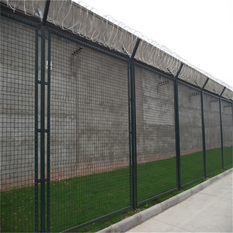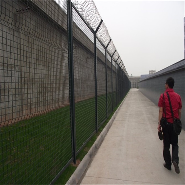 监狱金属网的种类很多,其中就包括监狱钢网墙,监狱金属钢网墙也可以叫监狱隔离网,是一种由钢丝焊接后再镀锌再喷塑或者浸塑的高端护栏网产品。通常采用Y字型立柱,这种造型是为了方便在顶部架设刀片刺网,这种组合模式可以大大提高监狱隔离网的安全防护性能。
