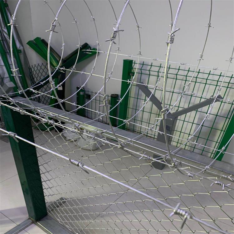 新型铝包钢机场围界护栏网产品介绍:铝包钢机场围界网是使用一种新型原材料铝包钢丝制作而成的机场围界网产品,铝包钢是将钢丝芯线外层包裹一层铝作为外层防腐材料,它比传统的PE或者PVC包塑钢丝防腐性能更强,通常可以延长机场围界产品使用寿命10-15年以上,适合于沿海空气湿润腐蚀性强的地区和环境较恶劣的沙漠边缘地带。铝包钢机场围界网孔一般为55*55mm,丝径3.2mm,顶部可搭配有V字叉和刀刺滚笼以加强防护能力。它还有一个优点就是铝层是与钢丝一起经机械拉拔到一起的,不易脱落。