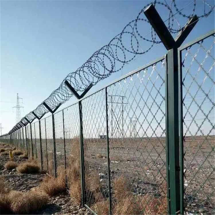 监狱刀片刺隔离网主要用于园林公寓、机关单位、监狱、哨所、边防等的圈禁防护。刀刺隔离网由锐利尖角镀锌钢板或不锈钢薄板做刀片,高张力钢丝做芯线组合而成的阻绝器材。由于刀片刺绳隔离网造形独特不易触摸,因而能达到很好的防护隔离效果。施工迅速,既省经费,又可达到安全隔离网效果。