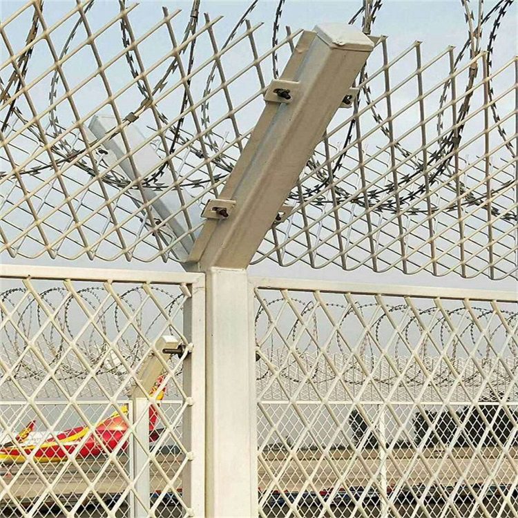 6、机场护栏网特点:如果在机场护栏网顶部加装刀片刺丝、刀片刺绳后又很好的增强了安全防护性能。采用电镀、热镀、喷塑、浸塑等防腐形式。其产品造型美观、花色多样,既起到围栏作用,又起到美化作用。由于具有安全性高、防攀爬能力好,网片连接方式采用特制SBS紧扣件,有效防止人为的破坏性拆卸,机场护栏网横向四道折弯加强筋,使网面强度显著增加。
