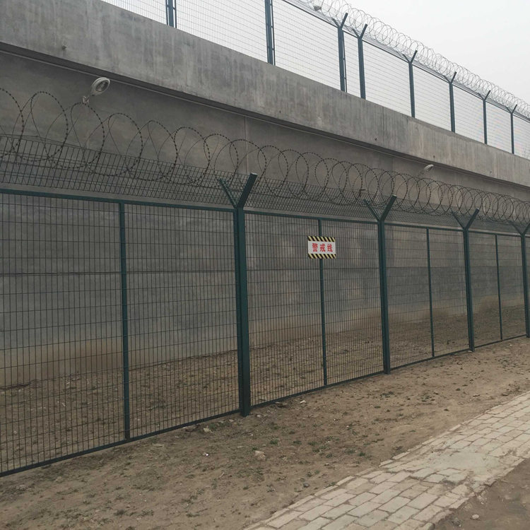 监狱金属隔离网的种类很多,是一种由钢丝焊接后再经防腐处理:热镀锌、喷塑或者浸塑的高端护栏网产品。通常采用Y字型立柱,这种造型是为了方便在顶部架设刀片刺网,这种组合模式可以大大提高监狱隔离网的安全防护性能。