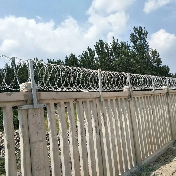 铁路刺丝滚笼防护栅栏主要包括刀片剌网,刺绳,和支架及卡扣等。安装好后具有很好的阻吓效果,与能起到相同作用的产品比起来性价比是高很多的。主要制作工艺就是由热镀锌钢板或者不锈钢钢板冲压出尖锐的刀片,然后由高张力镀锌钢丝或者不锈钢丝来做芯线组合构成的防护产品。配合立柱支架、加密支架、台阶支架安装在水泥立柱上起到固定的作用,一般间隔3米安装一个。