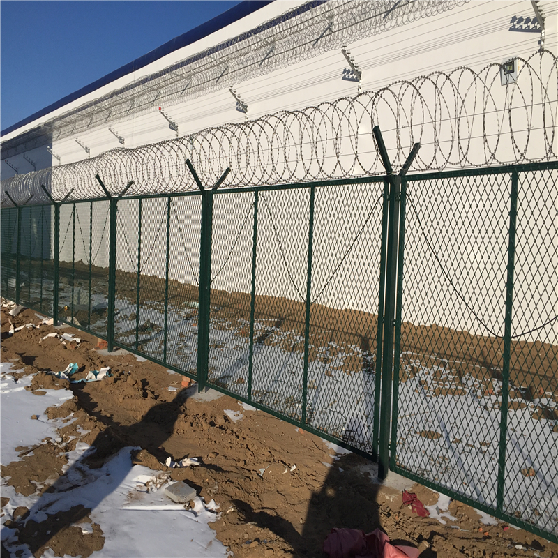 监狱钢网墙一般顶端都设有V型支架与立柱焊接。材料通常选择和立柱同等材料或者稍小规格材料搭配使用。V型支架的加装是为了将蛇腹形刀刺网固定在隔离网顶部,从而有效的增加监狱隔离网的防攀爬性和安全性。