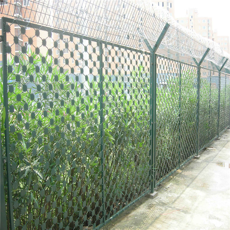 监狱护栏网或刀片刺网, 主要是采用高强度的刀片刺网与普通防护网的结合,由V型支架立拄,加强型焊接片网,安全防盗连接件和刀片刺网组成。刀片刺网是一种新型防护网,由锐利尖角镀锌钢板或不锈钢薄板做刀片,钢丝做芯线组合而成的防护器材。
