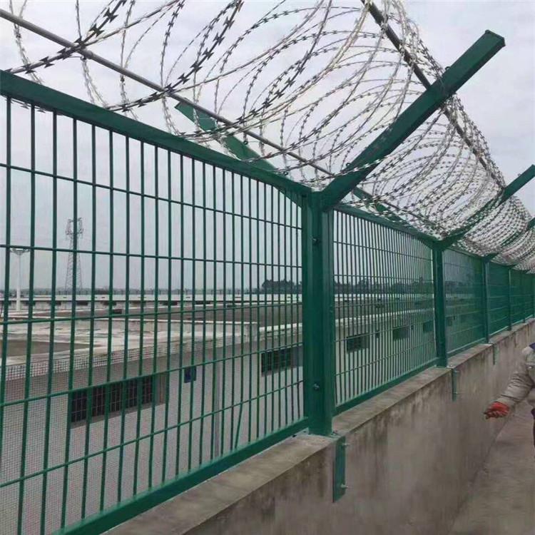 监狱护栏网又名监狱钢网墙、Y型安全防御护网和监狱隔离网。监狱护栏是由V型支架立柱、加强型焊接片网、安全防盗连接件和热镀锌刀片刺笼组成的一种护栏网,强度和安全防御性级别很高。这种护栏网广泛应用在监狱,看守所、拘留所、戒毒所、未管所、军事基地等高安全场所。监狱隔离网可平地安装,也可在围墙上二次安装,有效防止攀逃。 监狱隔离网常用的种类有监狱刀刺隔离网、监狱钢筋焊接隔离网、监狱密纹防爬网、监狱梅花刺隔离网和监狱菱形孔隔离网,润潭可以根据客户需求提供产品研发、设计规划、生产制造、安装及全方位的售后服务一体化解决方案。