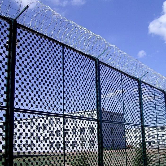 监狱护栏网又称监狱钢网墙,防攀网,监狱防护网等,主要是采用高强度的刀片刺网与普通防护网的结合,由V型支架立拄,加强型焊接片网,安全防盗连接件和刀片刺网组成。材质一般选用铝镁合金丝或是低碳钢丝。