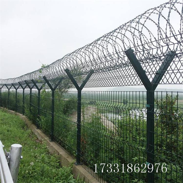 飞机场围界网顶部加装螺旋刀片刺网、螺旋刀片刺网大大增强了安全防护性能。采用电镀、热镀、喷塑、浸塑等防腐表面处理,具有很强的抗老化、抗晒、耐腐蚀等优异特点。其产品造型美观、颜色多样,既起到围护的作用,又起到美化的作用。由于具有安全性高、防攀爬能力好,网片连接方式采用特制SBS紧扣件,有效的制止了人为破坏性的拆卸,横向四道折弯加强筋,使网面强度更加增强。